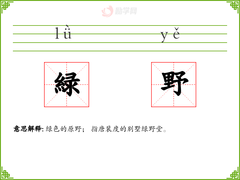 緑野的意思是:绿色的原野; 指唐裴度的别墅绿野堂。