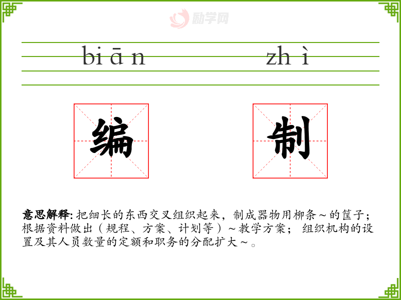 编制的意思是:把细长的东西交叉组织起来,制成器物用柳条~的筐子; 根据资料做出(规程、方案、计划等)~教学方案; 组织机构的设置及其人员数量的定额和职务的分配扩大~。