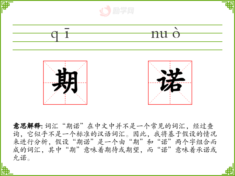 词汇“期诺”在中文中并不是一个常见的词汇,经过查询,它似乎不是一个标准的汉语词汇。因此,我将基于假设的情况来进行分析,假设“期诺”是一个由“期”和“诺”两个字组合而成的词汇,其中“期”意味着期待或期望,而“诺”意味着承诺或允诺。
