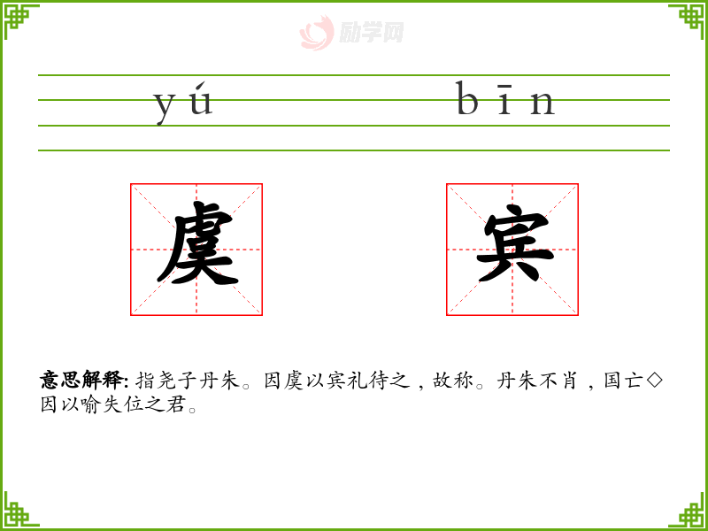 虞宾的意思是:指尧子丹朱。因虞以宾礼待之﹐故称。丹朱不肖﹐国亡◇因以喻失位之君。