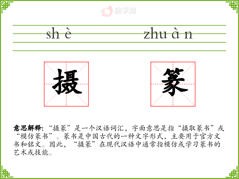 - 在学*书法的过程中,摄篆是必不可少的一步,它帮助我们理解古代文字的结构和美感。