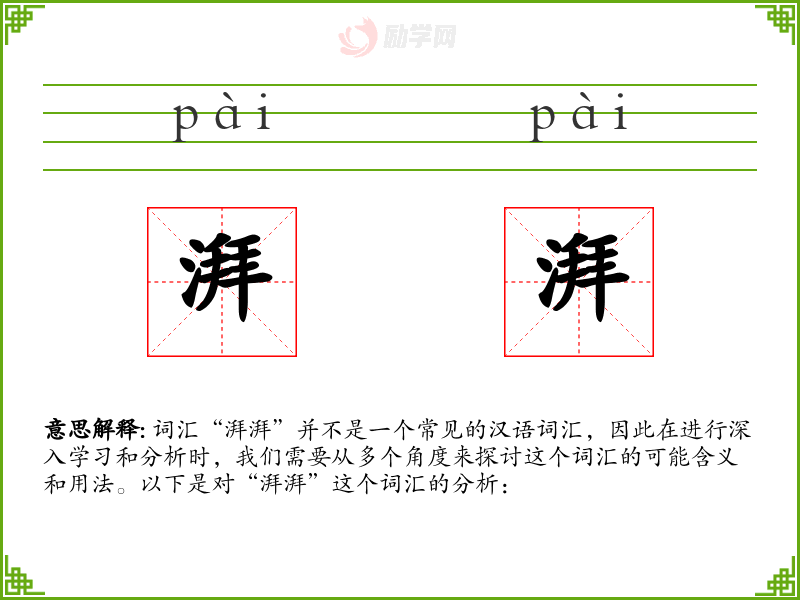 词汇“湃湃”并不是一个常见的汉语词汇,因此在进行深入学习和分析时,我们需要从多个角度来探讨这个词汇的可能含义和用法。以下是对“湃湃”这个词汇的分析: