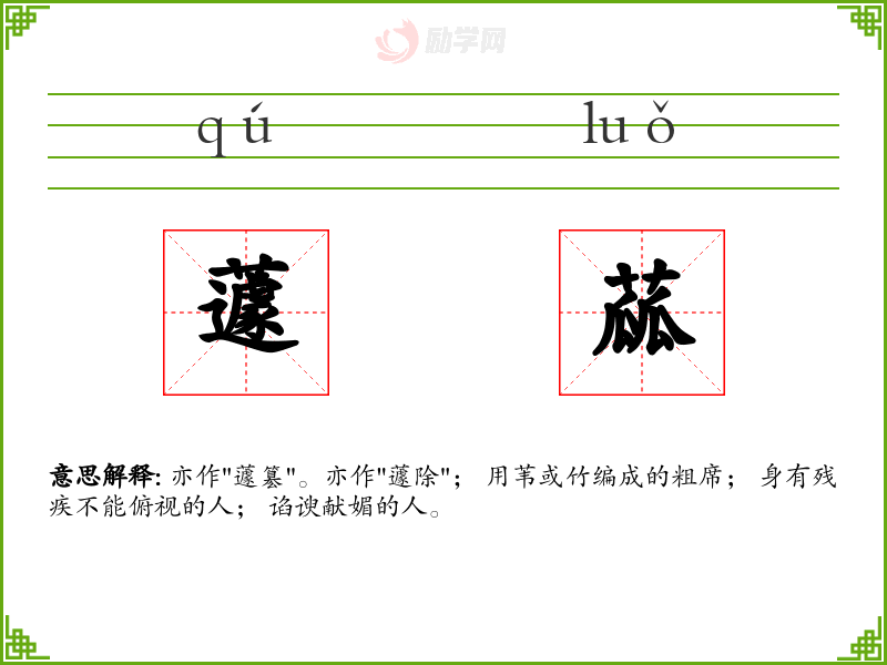 1.亦作"蘧簒"。亦作"蘧除"; 用苇或竹编成的粗席; 身有残疾不能俯视的人; 谄谀献媚的人。