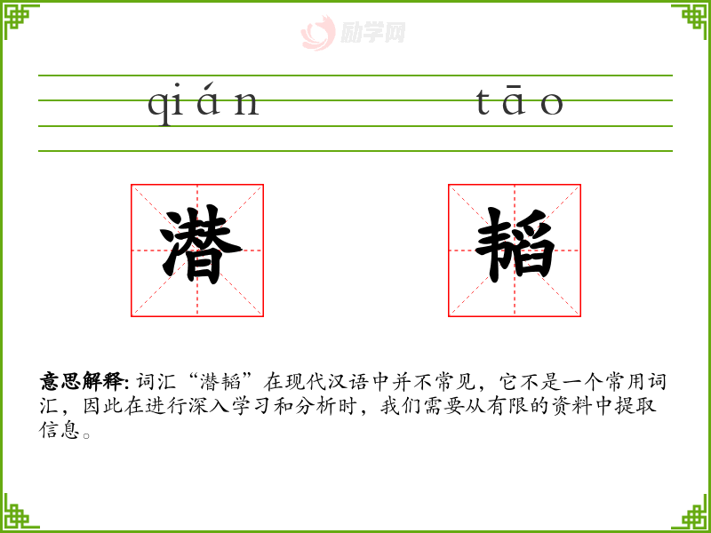 词汇“潜韬”在现代汉语中并不常见,它不是一个常用词汇,因此在进行深入学*和分析时,我们需要从有限的资料中提取信息。
