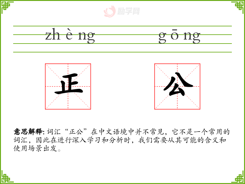 “正公”这个词虽然不常见,但它强调了正直和公正这两个重要的道德品质。在语言学*和表达中,了解和使用这样的词汇有助于提升我们的表达能力和对道德价值的理解。