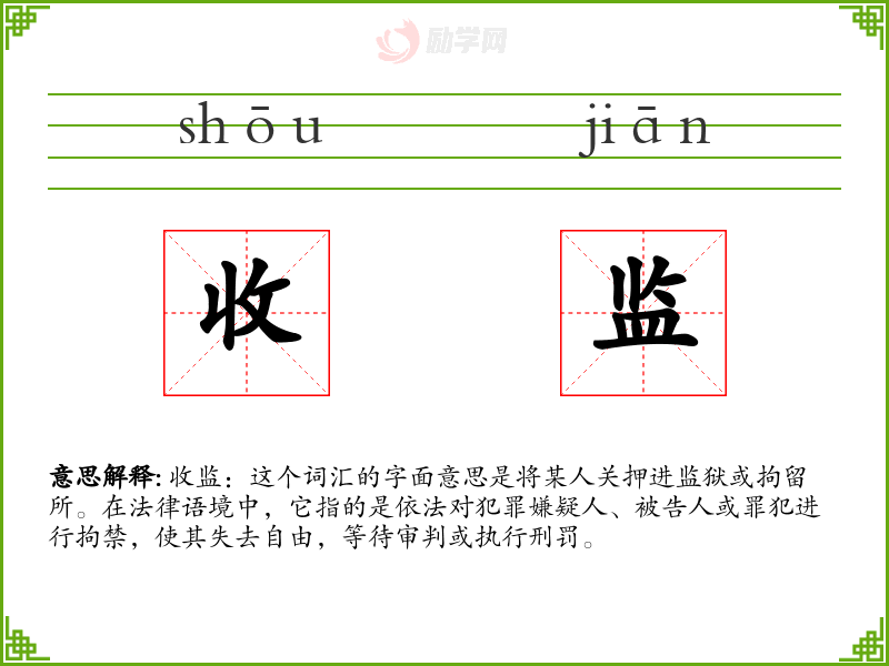 收监:这个词汇的字面意思是将某人关押进监狱或拘留所。在法律语境中,它指的是依法对犯罪嫌疑人、被告人或罪犯进行拘禁,使其失去自由,等待审判或执行刑罚。