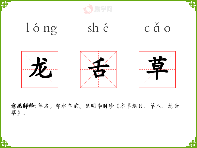 龙舌草的意思是:草名。即水车前。见明李时珍《本草纲目.草八.龙舌草》。
