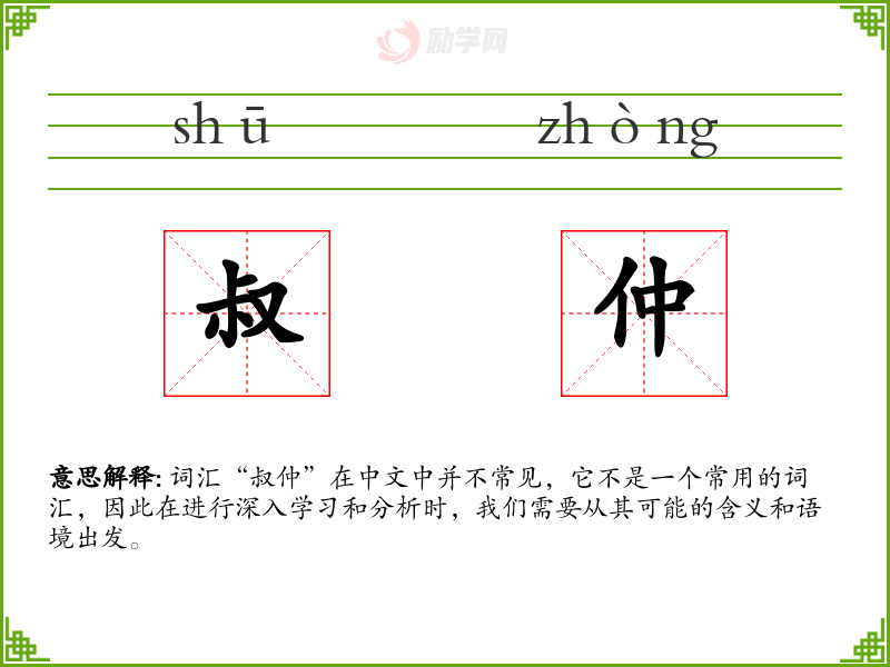 词汇“叔仲”在中文中并不常见,它不是一个常用的词汇,因此在进行深入学*和分析时,我们需要从其可能的含义和语境出发。
