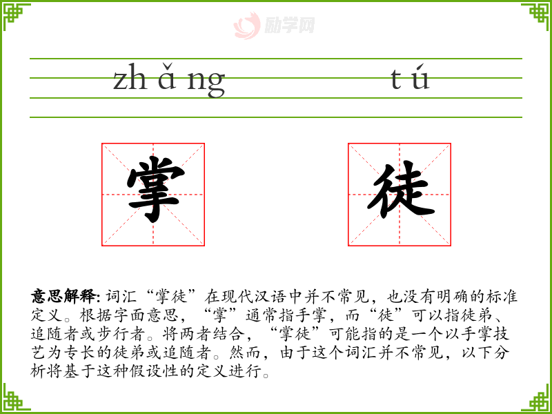 词汇“掌徒”在现代汉语中并不常见,也没有明确的标准定义。根据字面意思,“掌”通常指手掌,而“徒”可以指徒弟、追随者或步行者。将两者结合,“掌徒”可能指的是一个以手掌技艺为专长的徒弟或追随者。然而,由于这个词汇并不常见,以下分析将基于这种假设性的定义进行。