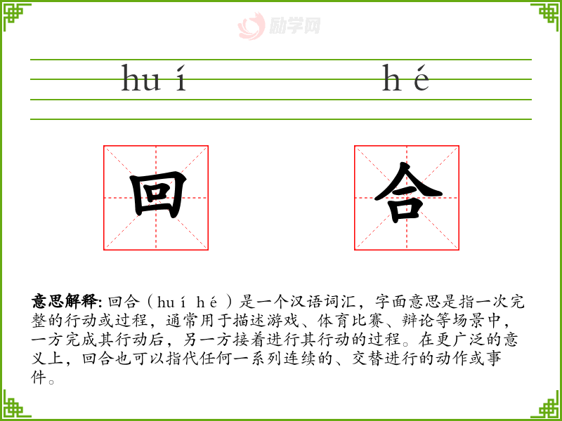 回合(huí hé)是一个汉语词汇,字面意思是指一次完整的行动或过程,通常用于描述游戏、体育比赛、辩论等场景中,一方完成其行动后,另一方接着进行其行动的过程。在更广泛的意义上,回合也可以指代任何一系列连续的、交替进行的动作或**。