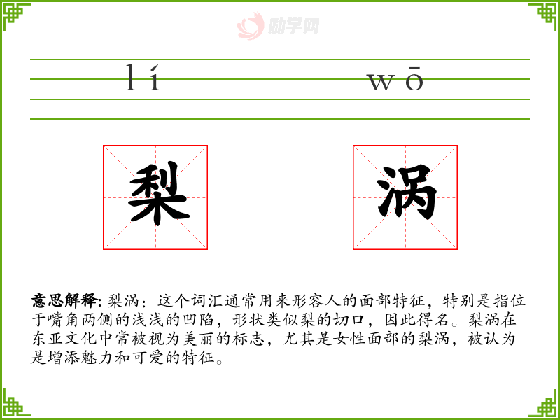 梨涡:这个词汇通常用来形容人的面部特征,特别是指位于嘴角两侧的浅浅的凹陷,形状类似梨的切口,因此得名。梨涡在东亚文化中常被视为美丽的标志,尤其是女性面部的梨涡,被认为是增添魅力和可爱的特征。