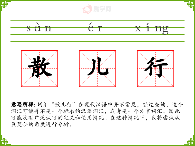 由于“散儿行”不是一个标准词汇,我们无法提供一个确切的基本定义。它可能是某个地区方言中的词汇,或者是某个特定社群中的俚语。