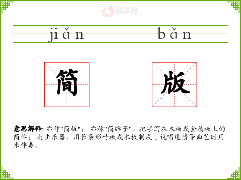 简版的意思是:亦作"简板"; 亦称"简牌子"。把字写在木板或金属板上的简帖; 打击乐器。用长条形竹板或木板制成﹐说唱道情等曲艺时用来伴奏。
