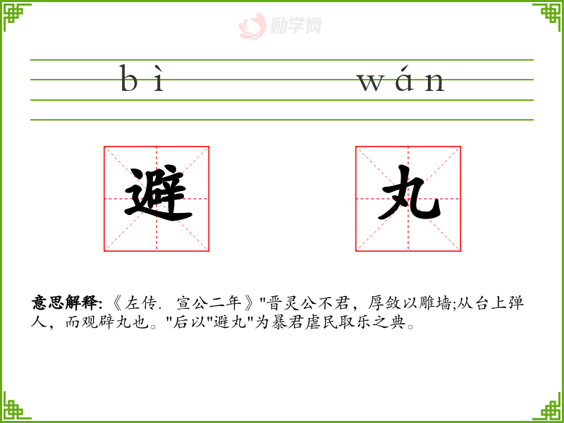避丸的意思是:《左传.宣公二年》"晋灵公不君,厚敛以雕墙;从台上弹人,而观辟丸也。"后以"避丸"为暴君虐民取乐之典。
