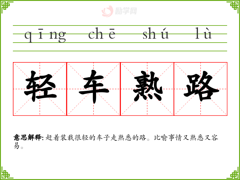 赶着装载很轻的车子走熟悉的路。比喻事情又熟悉又容易。