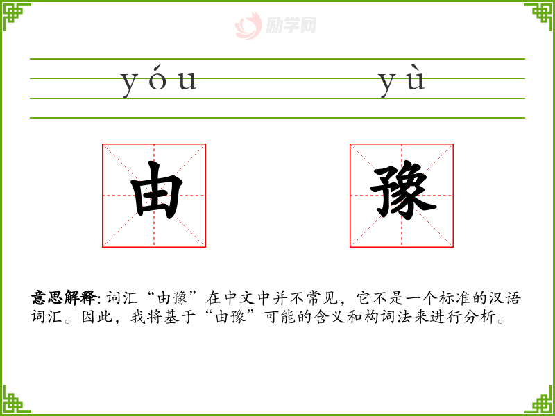 词汇“由豫”在中文中并不常见,它不是一个标准的汉语词汇。因此,我将基于“由豫”可能的含义和构词法来进行分析。