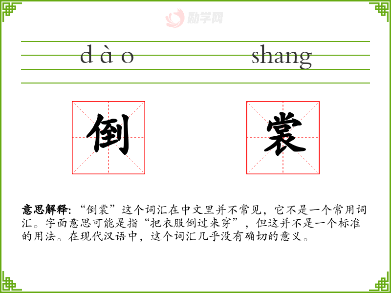 “倒裳”这个词汇在中文里并不常见,它不是一个常用词汇。字面意思可能是指“把衣服倒过来穿”,但这并不是一个标准的用法。在现代汉语中,这个词汇几乎没有确切的意义。