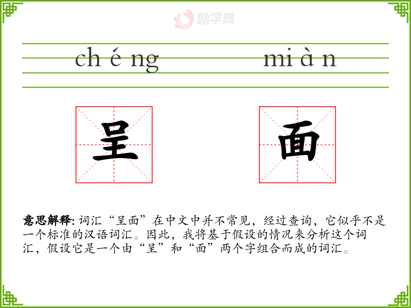 词汇“呈面”在中文中并不常见,经过查询,它似乎不是一个标准的汉语词汇。因此,我将基于假设的情况来分析这个词汇,假设它是一个由“呈”和“面”两个字组合而成的词汇。