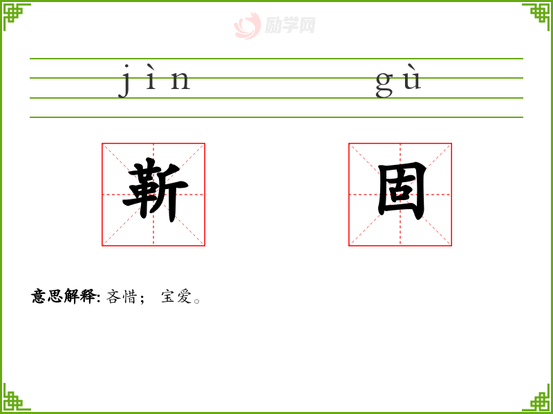《说文》-固,四塞也。 《诗·小雅·天保》。传:“固,坚也。”-亦孔之固。 《左传·成公十六年》-脩陈固列。 《楚辞·招魂》-弱颜固植。 《吕氏春秋·达郁》-筋骨欲其固也。 汉·贾谊《过秦论》-秦孝公据殽函之固。 《荀子·王霸》-如是则兵劲城固,敌国畏之。 《韩非子·难势》-良马固车。