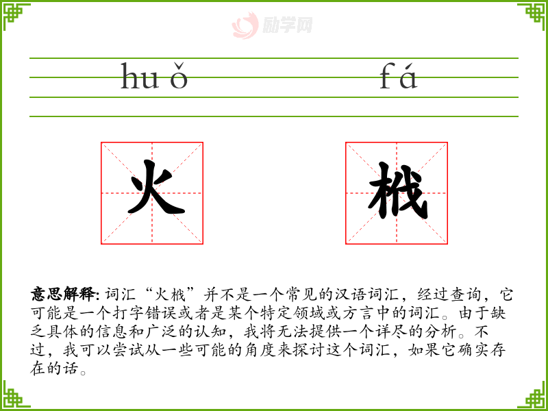 由于“火栰”不是一个标准词汇,我们无法对其进行深入的分析和总结。在语言学习中,了解和使用标准词汇是非常重要的,因为它们能够确保沟通的有效性和准确性。如果“火栰”是一个特定领域的术语,那么在学习和使用时应当注意其特定的语境和含义。