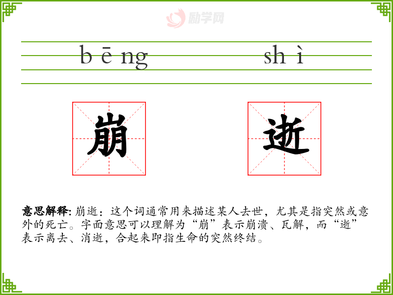 崩逝:这个词通常用来描述某人去世,尤其是指突然或意外的死亡。字面意思可以理解为“崩”表示崩溃、瓦解,而“逝”表示离去、消逝,合起来即指生命的突然终结。