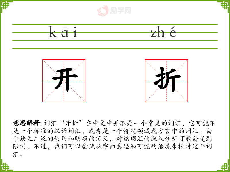由于“开折”不是一个常见的词汇,它在不同语境下的使用可能非常有限。如果它出现在某个特定的文学作品或方言中,可能需要具体的语境来解释其含义。