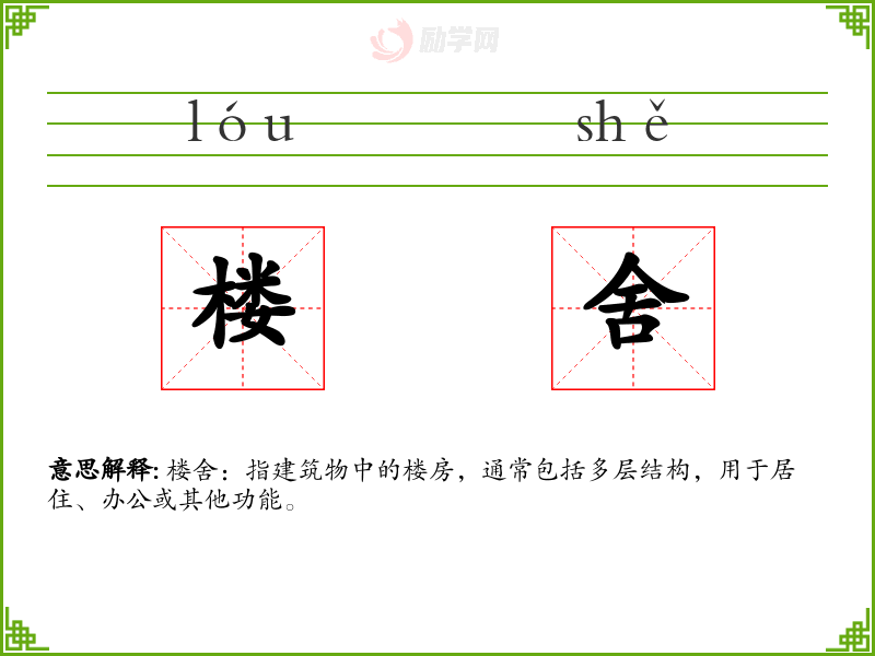 - 专业领域:在建筑学或城市规划中,楼舍可能涉及更专业的术语,如“高层楼舍的结构设计”。