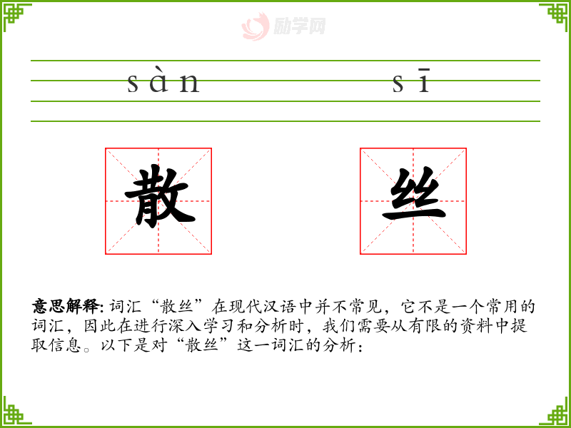 词汇“散丝”在现代汉语中并不常见,它不是一个常用的词汇,因此在进行深入学*和分析时,我们需要从有限的资料中提取信息。以下是对“散丝”这一词汇的分析:
