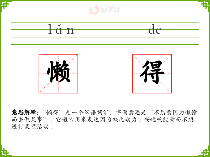 “懒得”由“懒”和“得”组成,其中“懒”表示懒惰,“得”在这里表示程度或可能性。这个词在汉语中有着悠久的历史,但其具体词源和演变过程需要进一步的语言学研究。