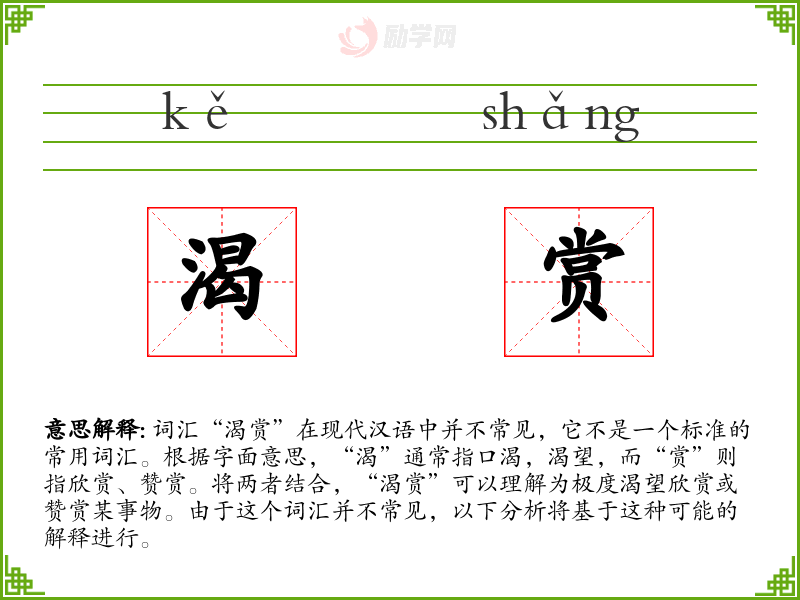 结合图片,“渴赏”可能让人联想到一幅美丽的自然风光或一幅艺术作品,激发人们对美的欣赏和渴望。在听觉上,它可能与一段优美的音乐或诗朗诵相关联,唤起人们对艺术的热爱。