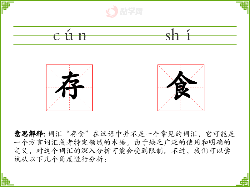 词汇“存食”在汉语中并不是一个常见的词汇,它可能是一个方言词汇或者特定领域的术语。由于缺乏广泛的使用和明确的定义,对这个词汇的深入分析可能会受到限制。不过,我们可以尝试从以下几个角度进行分析: