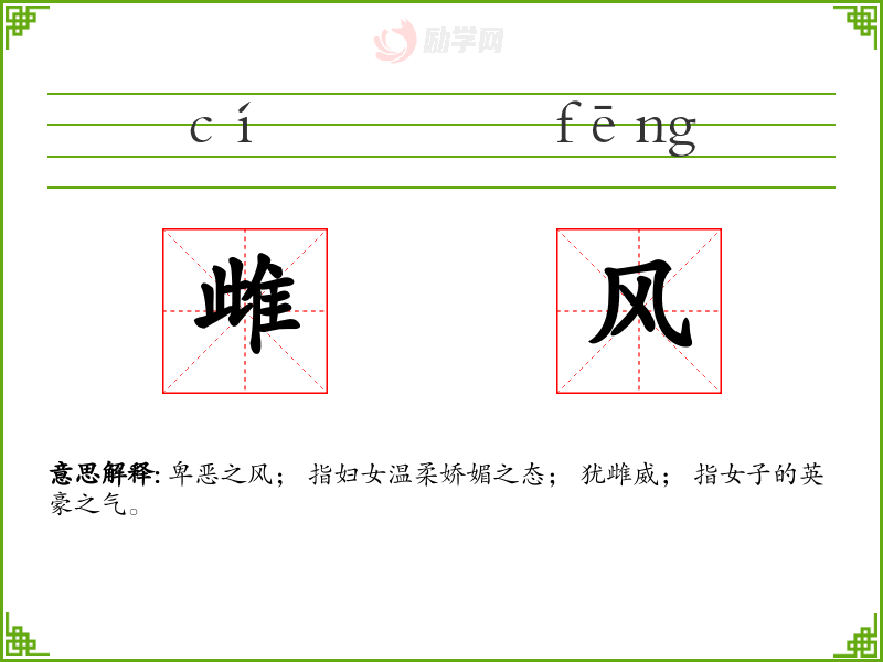 雌风的意思是:卑恶之风; 指妇女温柔娇媚之态; 犹雌威; 指女子的英豪之气。
