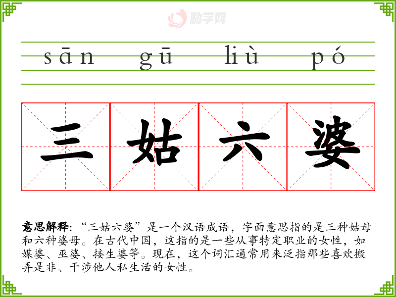 “三姑六婆”是一个汉语成语,字面意思指的是三种姑母和六种婆母。在古代**,这指的是一些从事特定职业的女性,如媒婆、巫婆、接生婆等。现在,这个词汇通常用来泛指那些喜欢搬弄是非、干涉他人私生活的女性。