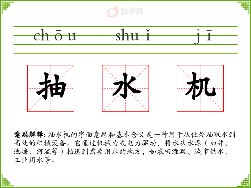 同义词:水泵、汲水机、抽水泵 反义词:注水机(用于将水注入某个容器或系统)