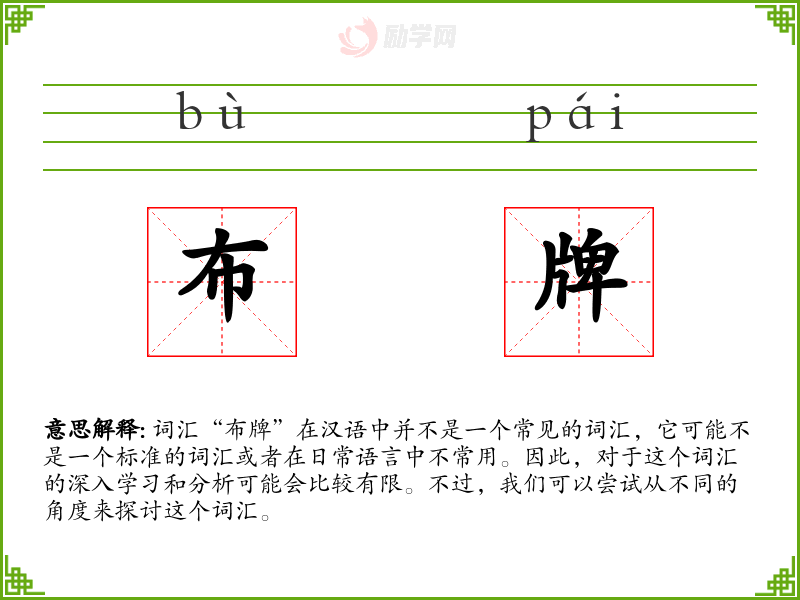 尽管“布牌”不是一个常见的词汇,但它可能在某些特定的语境中具有特殊的意义和用途。在语言学习和表达中,了解这样的词汇可以帮助我们更好地理解和欣赏不同的文化和传统。