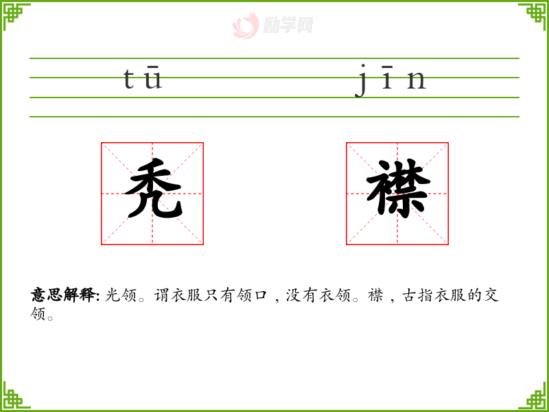 秃襟的意思是:光领。谓衣服只有领口﹐没有衣领。襟﹐古指衣服的交领。