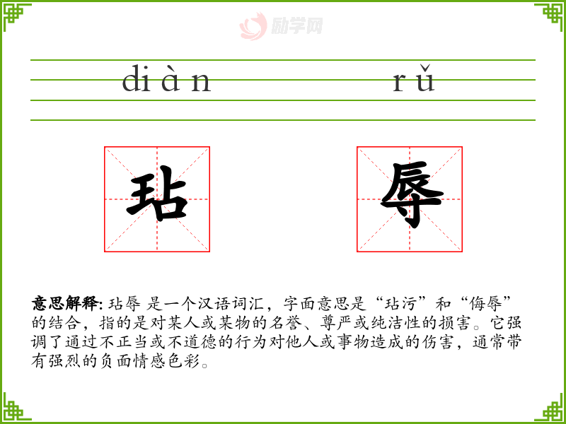 玷辱的意思是:使蒙受耻辱:~祖先|~门户。