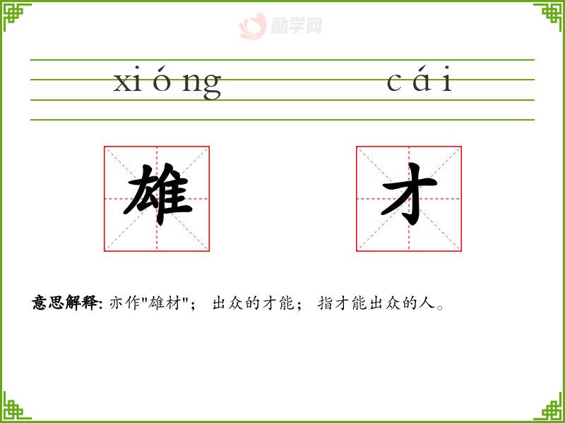 雄才的意思是:亦作"雄材"; 出众的才能; 指才能出众的人。