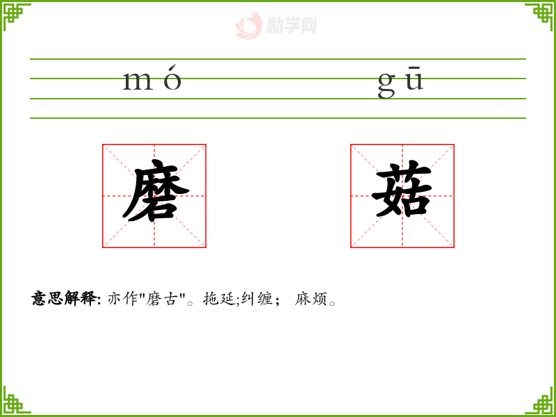 磨菇的意思是:亦作"磨古"。拖延;纠缠; 麻烦。