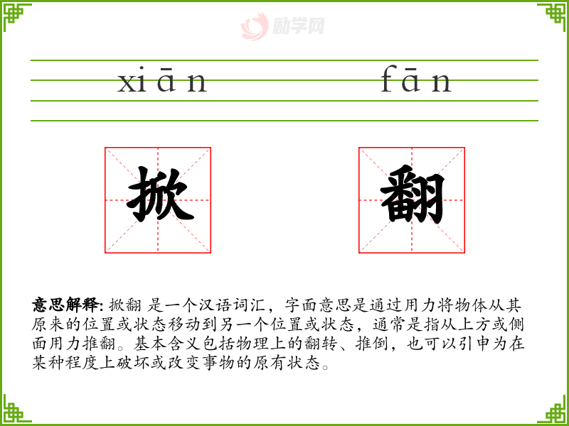 “掀翻”是一个多功能的词汇,不仅描述物理动作,还能传达强烈的情感和象征意义。在语言学*和表达中,理解和正确使用这个词汇可以丰富我们的表达方式,增强语言的表现力。