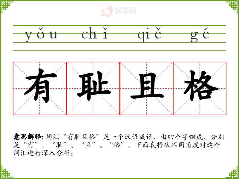 词汇“有耻且格”是一个汉语成语,由四个字组成,分别是“有”、“耻”、“且”、“格”。下面我将从不同角度对这个词汇进行深入分析: