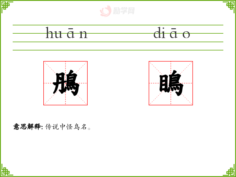 鴅[ huān ] 1. 古代传说中的一种人面鸟喙的怪鸟。 [更多解释]
