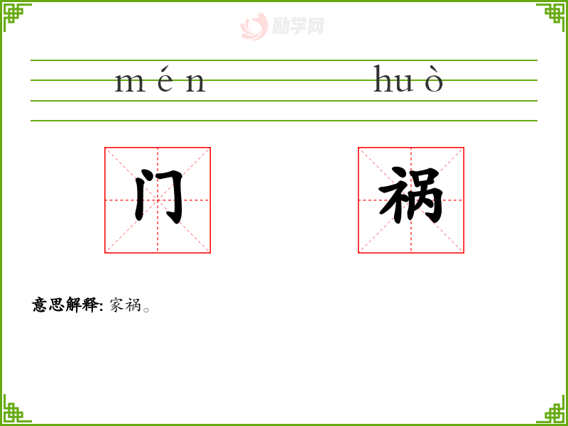 《说文》-禍,害也。神不福也。 《周礼·掌客》-禍灾杀礼。 《史记·屈原贾生列传》-禍兮福所倚。 《荀子·天论》-逆其类者谓之禍。 《论衡·累害》-来不由我,古谓之祸。 《韩非子·大体》-鱼无失水之祸。 《韩非子·十过》-不顾国政,则亡国之祸也。 《战国策·赵策》-近者祸及身。 《淮南子·人间训》-不能为祸。 明·魏禧《大铁椎传》-祸且及汝。 《资治通鉴》-祸至无日。 清·龚自珍《病梅馆记》-文人画士之祸。 《广东军务记》-祸及枯骨。