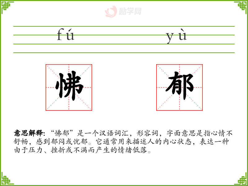 “怫郁”是一个汉语词汇,形容词,字面意思是指心情不舒畅,感到郁闷或忧郁。它通常用来描述人的内心状态,表达一种由于压力、挫折或不满而产生的情绪低落。