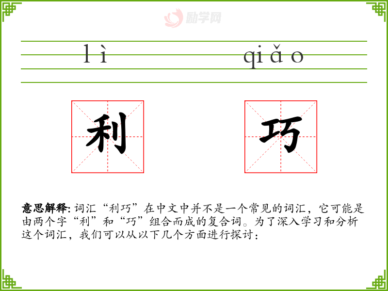 词汇“利巧”在中文中并不是一个常见的词汇,它可能是由两个字“利”和“巧”组合而成的复合词。为了深入学习和分析这个词汇,我们可以从以下几个方面进行探讨: