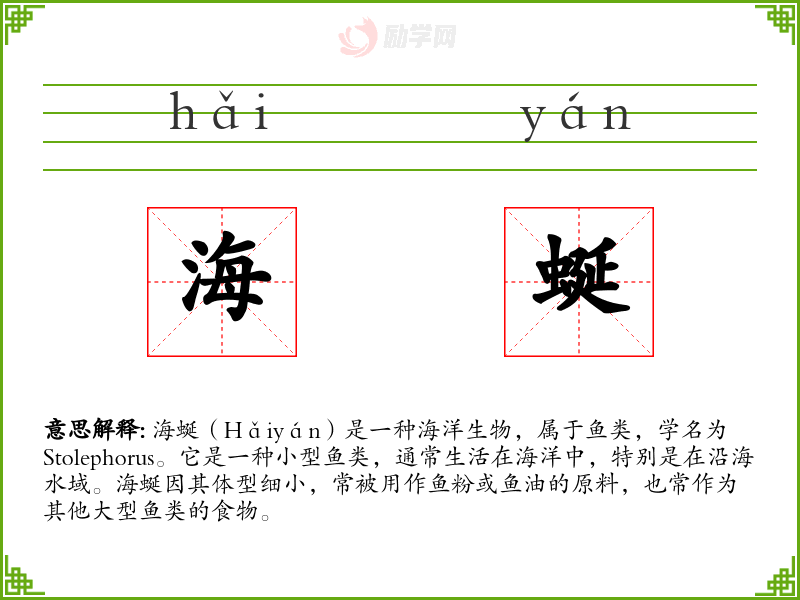 海蜒(Hǎiyán)是一种海洋生物,属于鱼类,学名为Stolephorus。它是一种小型鱼类,通常生活在海洋中,特别是在沿海水域。海蜒因其体型细小,常被用作鱼粉或鱼油的原料,也常作为其他大型鱼类的食物。
