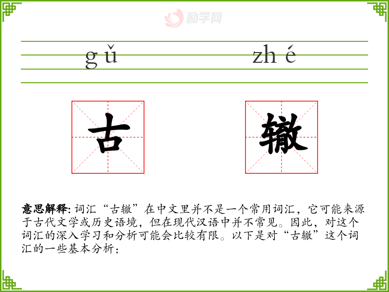 词汇“古辙”在中文里并不是一个常用词汇,它可能来源于古代文学或历史语境,但在现代汉语中并不常见。因此,对这个词汇的深入学习和分析可能会比较有限。以下是对“古辙”这个词汇的一些基本分析: