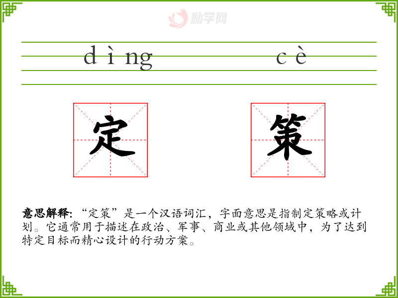 “定策”是一个汉语词汇,字面意思是指制定策略或计划。它通常用于描述在政治、军事、商业或其他领域中,为了达到特定目标而精心设计的行动方案。