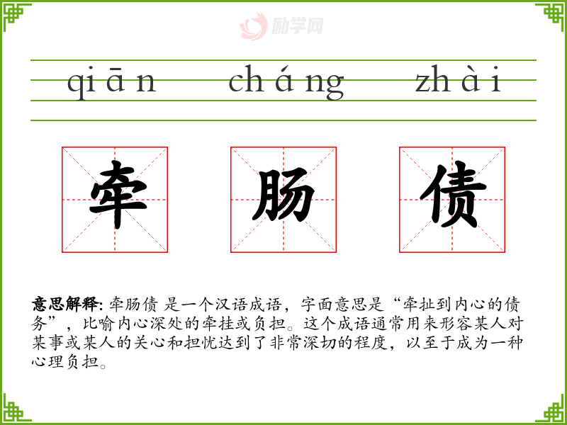 牵肠债 是一个汉语成语,字面意思是“牵扯到内心的债务”,比喻内心深处的牵挂或负担。这个成语通常用来形容某人对某事或某人的关心和担忧达到了非常深切的程度,以至于成为一种心理负担。