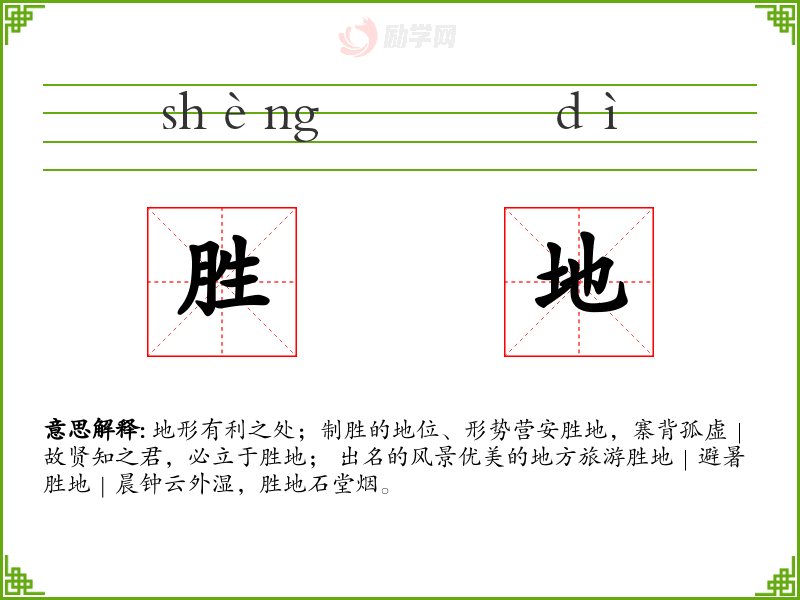 胜地的意思是:地形有利之处;制胜的地位、形势营安胜地,寨背孤虚|故贤知之君,必立于胜地; 出名的风景优美的地方旅游胜地|避暑胜地|晨钟云外湿,胜地石堂烟。